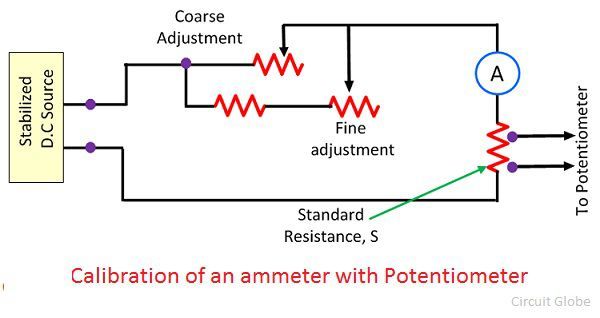 The standard resistance is connected in series with the ammeter which is to be calibrated. The potentiometer is used for measuring the voltage across the standard resistor. The below mention formula determines the current through the standard resistance.
