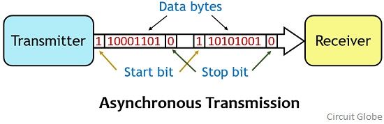 Here the data is transferred from an end to another in the form of bytes or characters. Thus when the transmitter wants to send data then it has to notify the receiver that it is going to send the data bits. So for this reason before sending the actual data the transmitter sends a start bit that notifies the receiver about the transmission.