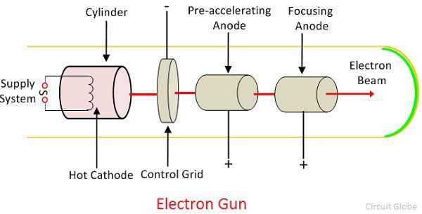 The main function of the electron gun is to produce and accelerate the beam of an electron inside the vacuum tube of the CRT. For generating and accelerating the gun requires the heater, cathode electrodes, grid, and different types of anodes. The detail explanation of their parts is shown below.