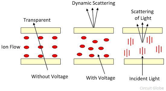 When the potential carrier flows through the light, the molecular alignment of the liquid crystal disrupts, and they produce disturbances. The liquid becomes transparent when they are not active. But when they are active their molecules turbulence causes scattered of light in all directions, and their cell appears bright. This type of scattering is known as the dynamic scattering. The construction of the dynamic scattering of the liquid crystal cell is shown in the figure