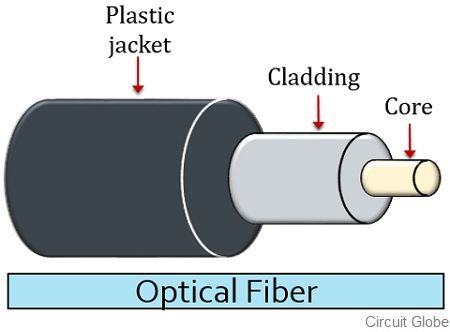 An optical fiber is basically a combination of core and cladding. Here, the core is a cylindrical dielectric composed of glass, through which light propagates and it is enclosed in a plastic cladding.