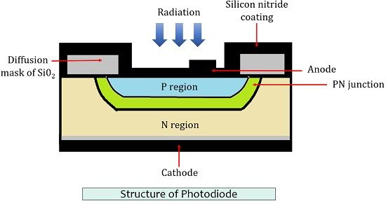 The PN junction of the device placed inside a glass material. This is done to order to allow the light energy to pass through it. As only the junction is exposed to radiation, thus, the other portion of the glass material is painted black or is metallised.