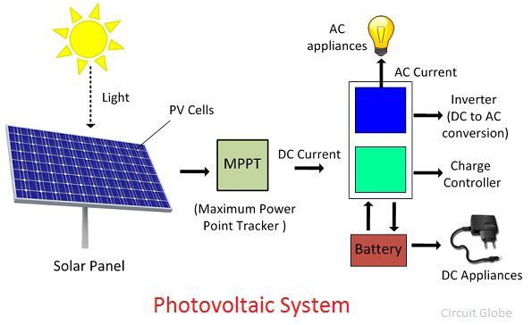 Maximum power point tracker, inverter, charge controller and battery are the name of the apparatus used for converting the radiation into an electrical voltage.
