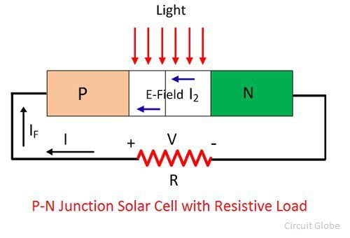 Consider the figure below shows the PV cell made of silicon and the resistive load is connected across it. The PV cell consists the P and N-type layer of semiconductor material. These layers are joined together to form the PN junction.