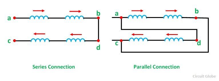 Group a-b consists of an odd number of coils that is (1, 3) whereas group c-d consists of an even number of coils (2,4). The two coils are connected in series. The terminals a, b, c, d are taken out as shown in the above figure. The coils are carrying current in the given directions by connecting coil groups either in series or in parallel as shown in the figure below: