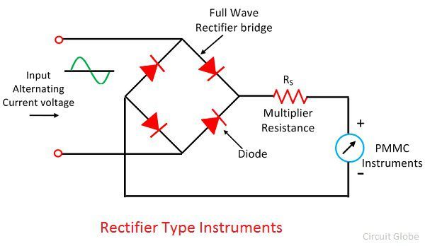 Definition: The instrument which uses the rectifying element for measuring the voltage and current is known as the rectifying instruments. The rectifying element converts the alternating current to the direct current which indicates by the DC responsive meter. The PMMC uses as an indicating instrument.