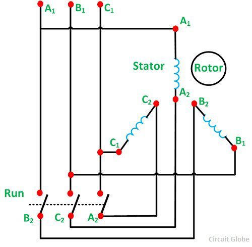 Firstly, the stator winding is connected in star and then in Delta so that the starting line current of the motor is reduced to one-third as compared to the starting current with the windings connected in delta. At the starting of an induction motor when the windings of the stator are star-connected, each stator phase gets a voltage VL/√3. Here VL is the line voltage.