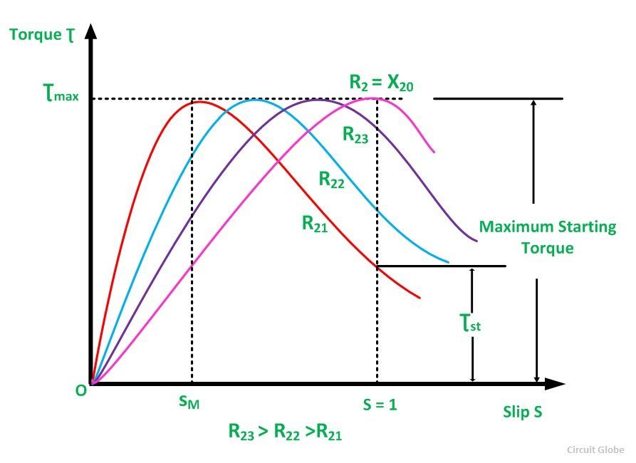 As the slip increases, the speed of the motor decreases with the increase in load. The term (sX20)2 becomes large. The term R22 may be neglected in comparison with the term (sX20)2 and the torque equation becomes as shown below:
