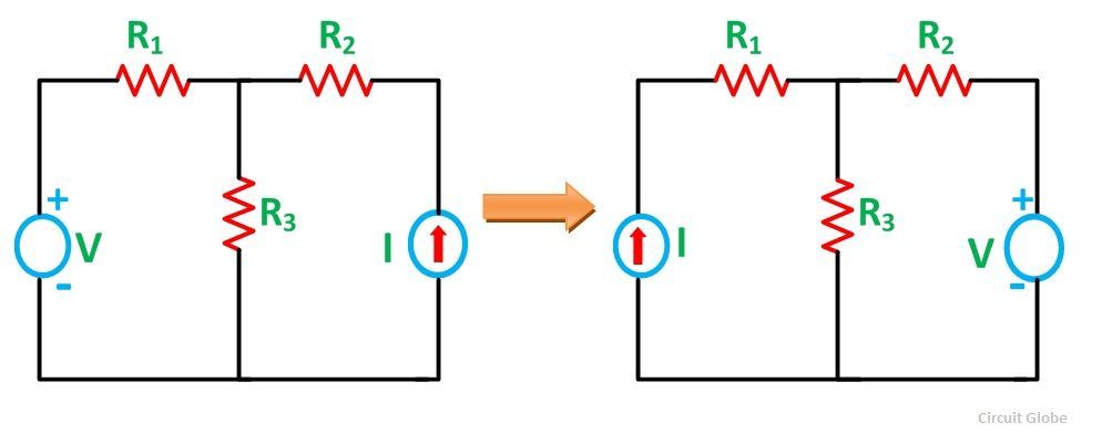 The location of the voltage source and the current source may be interchanged without a change in current. However, the polarity of the voltage source should be identical with the direction of the branch current in each position.